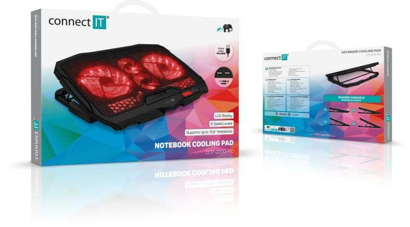 Chladiaca podložka pod notebook so štyrmi šesťrýchlostnými ventilátormi, digitálnym displejom, 4-stupňovým nastavením výšky a dvoma portmi USB. Podložka zabezpečuje odvod tepla z notebooku a jeho vetracích otvorov, ako aj priame chladenie krytu notebooku prostredníctvom cirkulácie chladného vzduchu, čím zlepšuje celkový výkon notebooku. Je plne kompatibilný s notebookmi do veľkosti 15,6" a vďaka kompaktným rozmerom je ideálny na prácu doma a v kancelárii, ako aj na cestovanie a časté prenášanie. Mimoriadne tichá prevádzka 4 ventilátorov vás nebude rušiť ani pri najnáročnejšej práci vyžadujúcej maximálnu koncentráciu. Nastaviteľná výška v 4 rôznych úrovniach zaručuje maximálne pohodlie aj počas dlhšej práce alebo hrania hier.