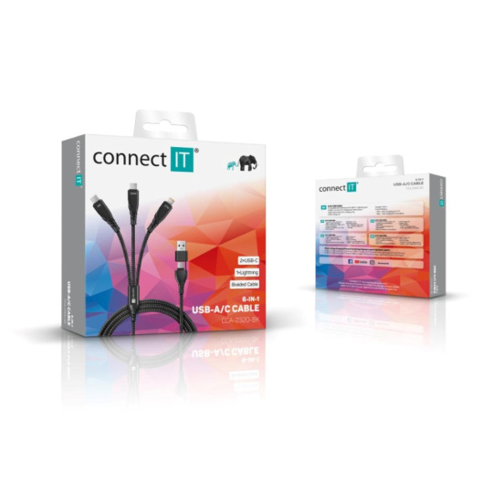 CONNECT IT Nabíjecí kabel Wirez 6v1, USB-C/USB, Lightning + 2x USB-C, 1.25m, černá
