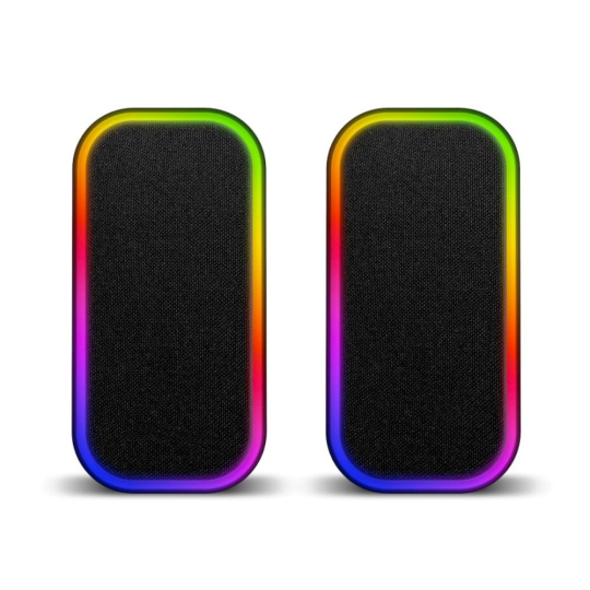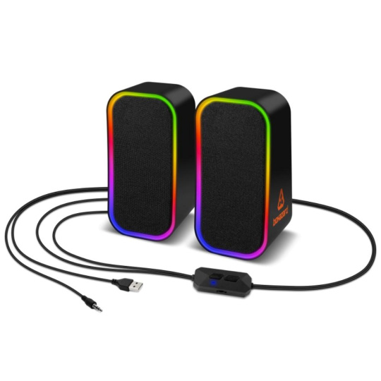 Reproduktory sú vybavené RGB Rainbow podsvietením a ovládaním hlasitosti/podsvietenia/vstupu na kábli.
