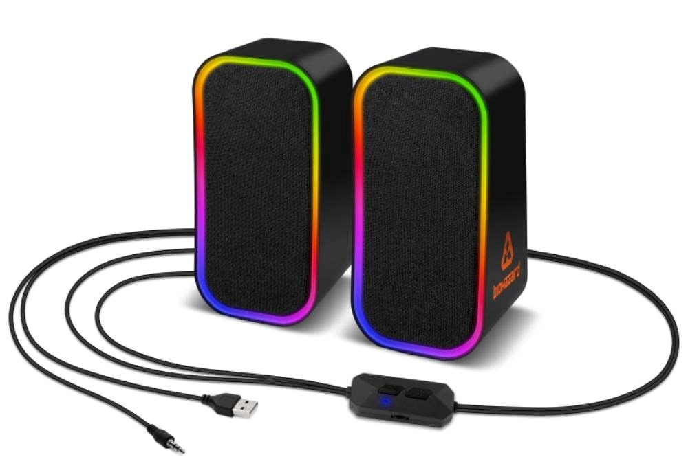 Gamingové reproduktory BIOHAZARD pre hráčov počítačových hier s pripojením pomocou bluetooth alebo AUX vstupu.