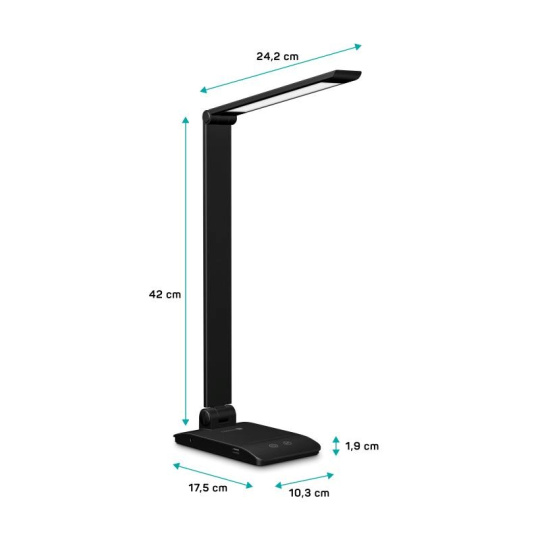 Vďaka sklopnému ramenu a krku nastavíte dokonalý uhol pre akúkoľvek prácu. Lampička disponuje USB-A výstupom s výkonom 5 W a dvoma praktickými dotykovými spínačmi, ktoré umožňujú zapnúť/ vypnúť lampu, nastaviť 3 úrovne jasu svetla alebo nastaviť farebnú teplotu svetla v 3 rôznych úrovniach (3000/4000/6500 K).