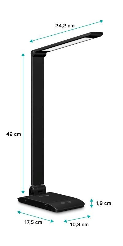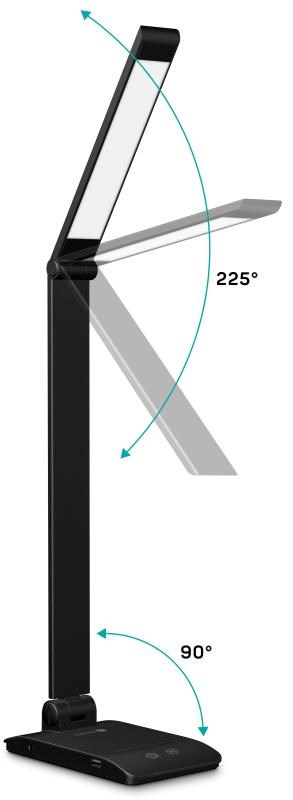 Vďaka sklopnému ramenu a krku nastavíte dokonalý uhol pre akúkoľvek prácu. Lampička disponuje USB-A výstupom s výkonom 5 W a dvoma praktickými dotykovými spínačmi, ktoré umožňujú zapnúť/ vypnúť lampu, nastaviť 3 úrovne jasu svetla alebo nastaviť farebnú teplotu svetla v 3 rôznych úrovniach (3000/4000/6500 K).