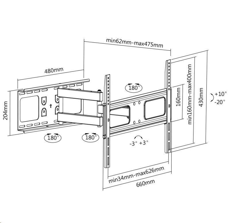 - Rozmery držiaka (š x v x h): 660 x 430 x 62~475 mm