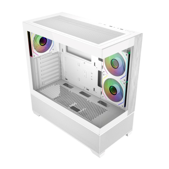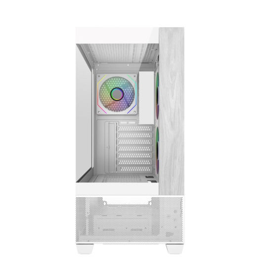 Model Elite 690 má čistý a moderný dizajn a je vybavený dvoma panelmi z tvrdeného skla na prednej a bočnej strane, ktoré prezentujú prémiové komponenty a osvetlenie RGB. Predný panel kombinuje prírodný akcent s textúrou dreva so spodným sťahom zo sieťoviny, čo prináša nielen estetickú teplo, ale aj efektívne prúdenie vzduchu. Vďaka rozsiahlemu vetraniu na hornej a spodnej strane podporuje skriňa univerzálnu konfiguráciu ventilátorov a chladičov, ktoré umožňujú výkonné vertikálne chladenie. Či už staval vysoko výkonnú prezentáciu alebo štýlovú stolnú zostavu, Elite 690 ponúka dokonalú rovnováhu medzi funkčnosťou a formou.