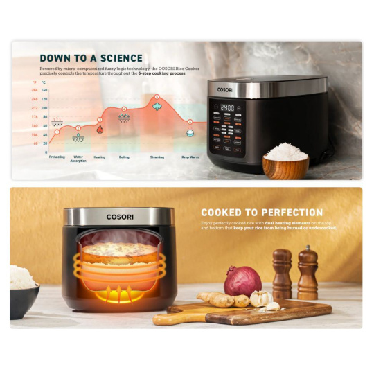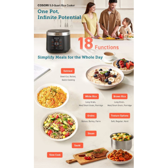 Multifunkčný rýžovar Cosori ponúka rôzne možnosti prípravy pokrmov: rôzne druhy a úrovne prípravy ryže (podľa chuti - štandardná, mäkká alebo tvrdšia), kaše a iné obilniny, ale aj ďalšie funkcie ako režim pomalého varenia, varenie v pare, dusenie, režim udržiavania teploty, odložené varenie, pečenie alebo režim rýchlej prípravy ryže.