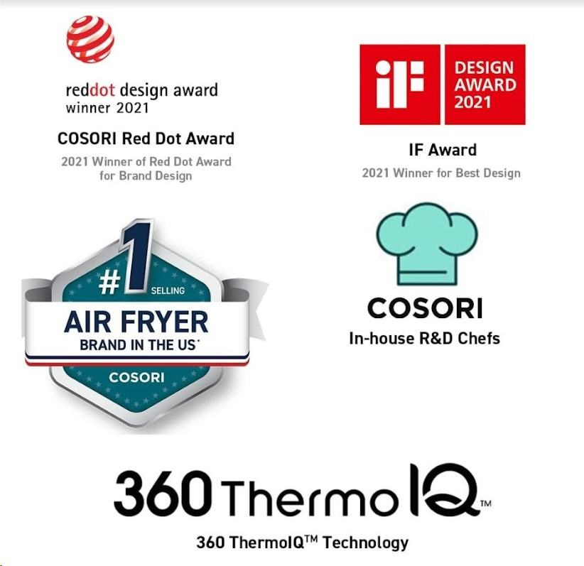 Dizajn teplovzdušnej fritézy COSORI CAF-P583S bol navrhnutý v Kalifornii. Vďaka svojej praktickosti, funkciám, ovládacím prvkom a prehľadnému naklonenému dotykovému LED displeju s ľahko prístupnými tlačidlami získal aj prestížne ocenenie Red Dot Award za najlepší dizajn.