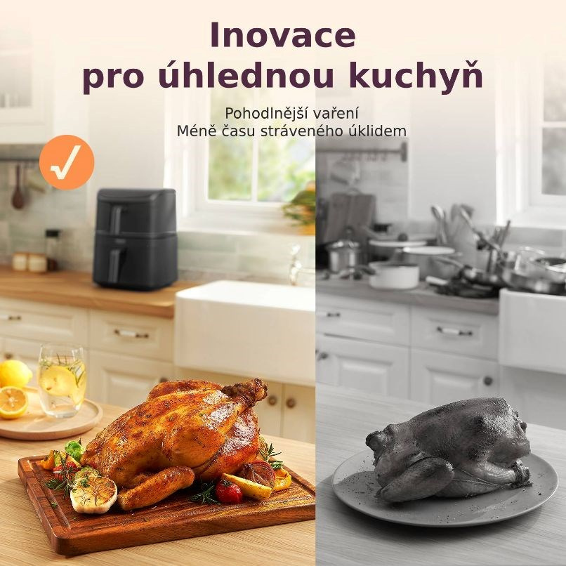 Vďaka pokročilým motorom a technológii Dual Blaze môžete pripravovať svoje obľúbené jedlá s použitím minimálneho množstva tuku, pričom ušetríte až 65 % nákladov a až 55 % času. Koše a taniere Crisper sú navyše vhodné do umývačky riadu! Netrávte zbytočne čas pri sporáku a dreze. Využívajte svoj čas rozumne.