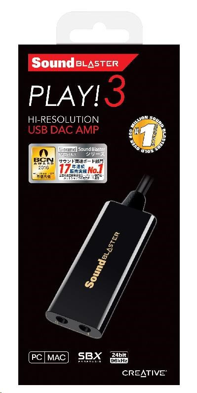 Sound Blaster PLAY! 3 obsahuje USB DAC a zosilňovač a umožňuje rýchlo rozšíriť zvuk vašej základnej dosky. Je vhodný pre počítače PC aj Mac. Obsahuje výkonný zosilňovač pre celý rad slúchadiel: od jednoduchých mobilných slúchadiel do uší až po herné a štúdiové slúchadlá. Softvér Sound Blaster PLAY! ovládací panel 3, ktorý je k dispozícii na stiahnutie, ponúka úžasne realistický zvuk a ohromujúce zvukové efekty. Obsahuje aj optimalizované profily pre vybrané značky slúchadiel.