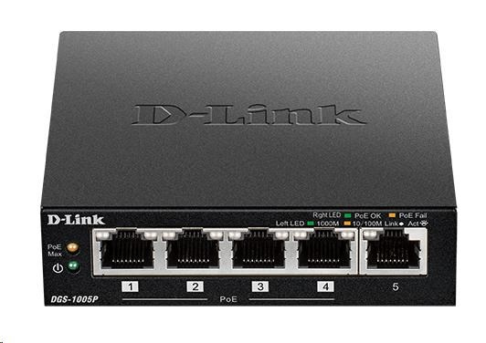 D-Link DGS-1005P 5-portový gigabitový stolový prepínač PoE+, 4 porty PoE+, rozpočet PoE 60 W
