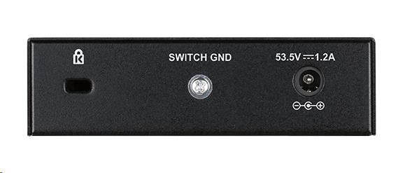 5-portový stolový gigabitový PoE+ prepínač - 60W výkon - 5-portový 10000BaseTX s automatickým vyjednávaním (NWAY) 10/100/1000Mbps - IEEE 802.3af/802.3at - Obsahuje 4 porty PoE (porty 1-4) - Automatický polovičný/úplný duplexný režim - Výstup PoE až 30 W na port - Automatická detekcia napájaného zariadenia - Podporuje štandard 802.1p QoS - Podporuje Jumbo Frame až do 9216Bajtov - Podporuje diagnostiku kábla - Technológia D-Link Green - Veľkosť stolného počítača (nie je k dispozícii sada na montáž do racku)..
