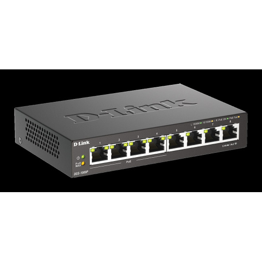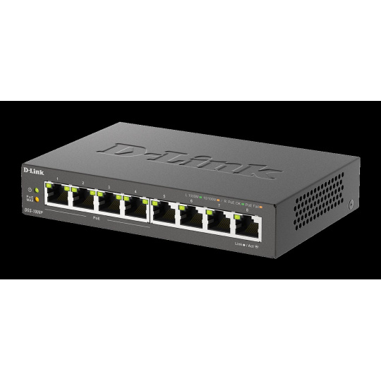 D-Link DGS-1008P 8-portový gigabitový stolový prepínač, 4 porty PoE+, rozpočet PoE 68 W