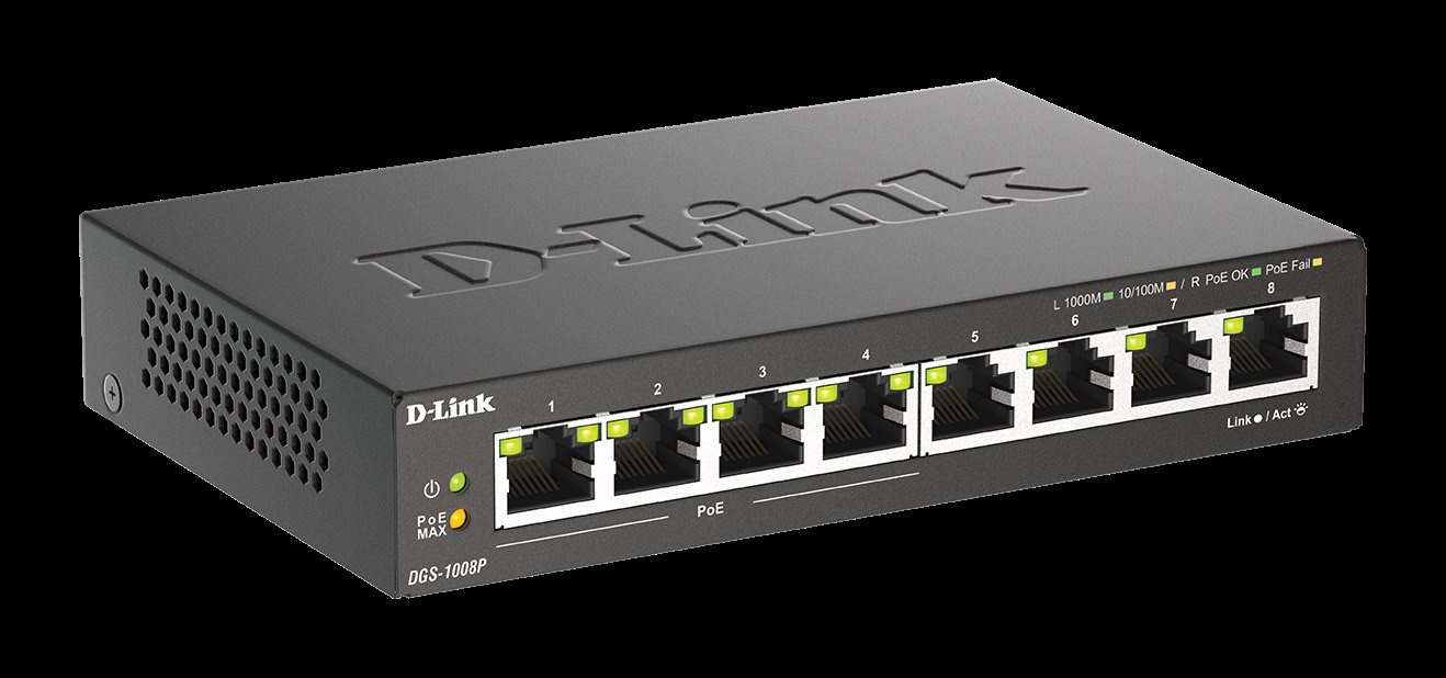 D-Link DGS-1008P 8-portový gigabitový stolový prepínač, 4 porty PoE+, rozpočet PoE 68 W