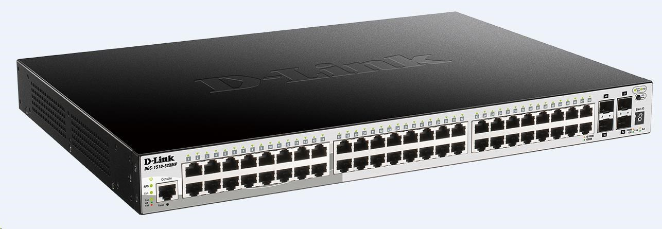D-Link DGS-1510-52XMP 52-portový gigabitový stohovateľný PoE inteligentný riadený prepínač vrátane 4 10G SFP+, 370W PoE rozpočet