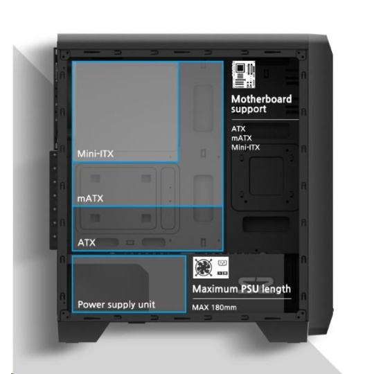 | Podpora základnej dosky | ATX, mATX, Mini-ITX |