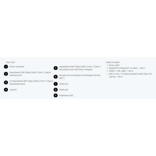 | Napájací kábla ? DisplayPort-DisplayPort 1.4 kábel - 1.80 m ? HDMI 2.1 FRL kábel - 1.80 m ? USB 3.2 Gen 1 (5 Gbps) vstupný kábel (Type A na Type B) - 1.80 m |