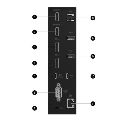 | HDMI 1 ? HDMI 2 ? DisplayPort (vstup) ? DisplayPort (výstup) ? USB 3.2 Gen1 Type-C upstream (Alt mode s DP 1.4, až 90W PD) ? RS232 ? Audio line-out ? USB 3.2 Gen1 Type-B (5Gbps) upstream ? USB 3.2 Gen1 Type-A (5Gbps) downstream (2) ? USB 3.2 Gen1 Type-C (5Gbps) downstream (až 15W PD) ? RJ45