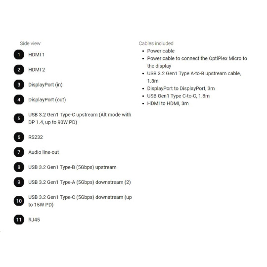 | Napájací kábel ? Napájací kábel na prepojenie OptiPlex Micro s displejom ? USB 3.2 Gen1 Type A na B upstream kábel, 1.8m ? DisplayPort na DisplayPort, 3m ? USB Gen1 Type C na C, 1.8m ? HDMI na HDMI, 3m |
