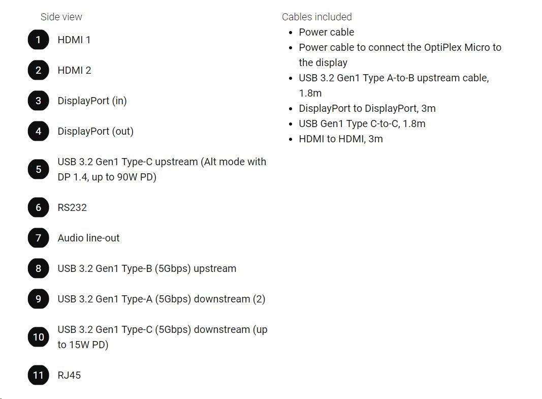 | Napájací kábel ? Napájací kábel na prepojenie OptiPlex Micro s displejom ? USB 3.2 Gen1 Type A na B upstream kábel, 1.8m ? DisplayPort na DisplayPort, 3m ? USB Gen1 Type C na C, 1.8m ? HDMI na HDMI, 3m |