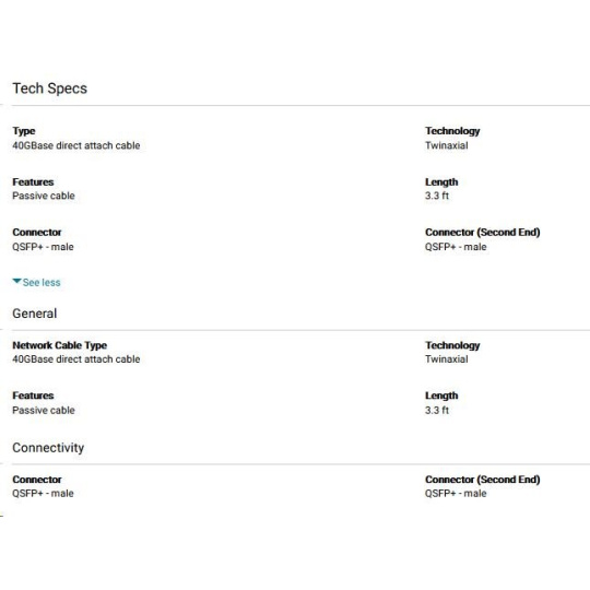 Owerview The Passive Direct attach copper cables provide highly reliable communication links with superior bit error rate (BER) performance. These copper cables are designed as a cost-effective and lower power alternative to optical cable assemblies for short length interconnects between active network equipment. Hot Pluggable QSFP+ - QSFP+ form factor Direct Attached Copper Cables Low power consumption and low crosstalk https://www.dell.com/en-us/work/shop/dell-networking-cable-qsfp-to-qsfp-40gbe-passive-copper-direct-attach-cable-1-meter-kit/apd/470-aavr/networking Type: 40GBase direct attach cable Technology: Twinaxial Features: Passive cable Length: 3.3 ft Connector: QSFP+ - male Connector (Second End): QSFP+ - male Compatibility This product is compatible with the following systems: Dell EMC Networking N2200-ON Dell EMC PowerSwitch Z9264F-ON Dell EMC PowerSwitch Z9332F-ON Dell EMC PowerSwitch Z9432F-ON Dell Networking N3132PX-ON Dell Networking S4112-ON Dell Networking S4128 Dell Networking S4148 Dell Networking S4148U Dell Networking S5212F-ON Dell Networking S5224F-ON OptiPlex GX260 MT PowerEdge C4140 PowerEdge C6420 PowerEdge FC640 PowerEdge M640 PowerEdge M640 VRTX PowerEdge R240 PowerEdge R340 PowerEdge R440 PowerEdge R540 PowerEdge R640 PowerEdge R6415 PowerEdge R740 PowerEdge R740XD PowerEdge R740xd2 PowerEdge R7415 PowerEdge R7425 PowerEdge R7515 PowerEdge R7525 PowerEdge R840 PowerEdge R940 PowerEdge R940xa PowerEdge T140 PowerEdge T340 PowerEdge T440 PowerEdge T640 PowerEdge XR2 PowerVault NX440.
