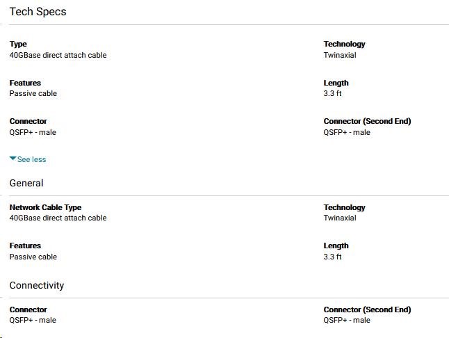Owerview The Passive Direct attach copper cables provide highly reliable communication links with superior bit error rate (BER) performance. These copper cables are designed as a cost-effective and lower power alternative to optical cable assemblies for short length interconnects between active network equipment. Hot Pluggable QSFP+ - QSFP+ form factor Direct Attached Copper Cables Low power consumption and low crosstalk https://www.dell.com/en-us/work/shop/dell-networking-cable-qsfp-to-qsfp-40gbe-passive-copper-direct-attach-cable-1-meter-kit/apd/470-aavr/networking Type: 40GBase direct attach cable Technology: Twinaxial Features: Passive cable Length: 3.3 ft Connector: QSFP+ - male Connector (Second End): QSFP+ - male Compatibility This product is compatible with the following systems: Dell EMC Networking N2200-ON Dell EMC PowerSwitch Z9264F-ON Dell EMC PowerSwitch Z9332F-ON Dell EMC PowerSwitch Z9432F-ON Dell Networking N3132PX-ON Dell Networking S4112-ON Dell Networking S4128 Dell Networking S4148 Dell Networking S4148U Dell Networking S5212F-ON Dell Networking S5224F-ON OptiPlex GX260 MT PowerEdge C4140 PowerEdge C6420 PowerEdge FC640 PowerEdge M640 PowerEdge M640 VRTX PowerEdge R240 PowerEdge R340 PowerEdge R440 PowerEdge R540 PowerEdge R640 PowerEdge R6415 PowerEdge R740 PowerEdge R740XD PowerEdge R740xd2 PowerEdge R7415 PowerEdge R7425 PowerEdge R7515 PowerEdge R7525 PowerEdge R840 PowerEdge R940 PowerEdge R940xa PowerEdge T140 PowerEdge T340 PowerEdge T440 PowerEdge T640 PowerEdge XR2 PowerVault NX440.