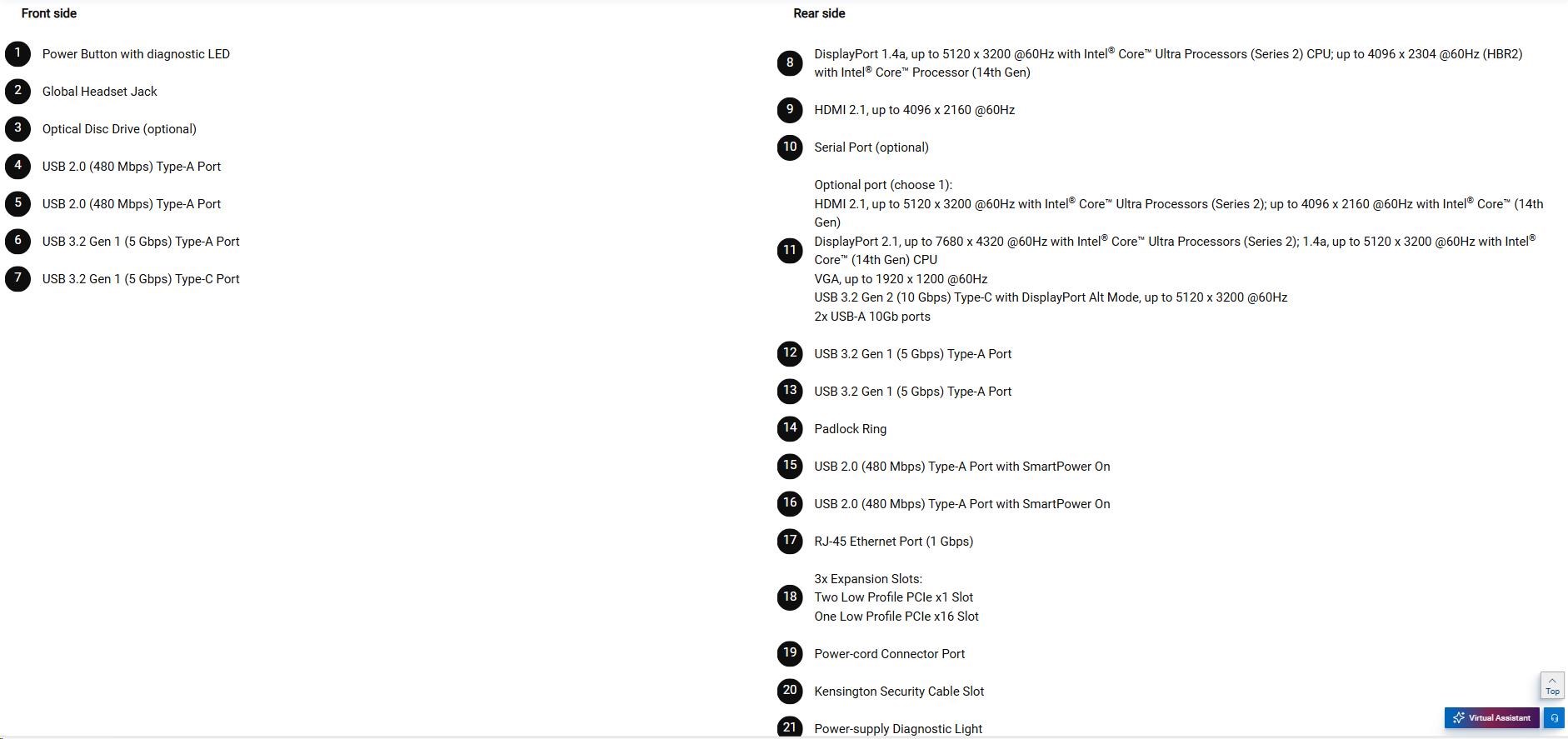 HDMI 2.1, up to 5120 x 3200 @60Hz with Intel® Core™ Ultra Processors (Series 2); up to 4096 x 2160 @60Hz with Intel® Core™ (14th Gen) DisplayPort 2.1, up to 7680 x 4320 @60Hz with Intel® Core™ UltraProcessors(Series 2); 1.4a, up to 5120 x 3200 @60Hz with Intel® Core™ (14th Gen) CPU VGA, up to 1920 x 1200 @60Hz USB 3.2 Gen 2 (10 Gbps) Type-C with DisplayPort Alt Mode, up to 5120 x 3200 @60Hz 2x USB-A 10Gb ports