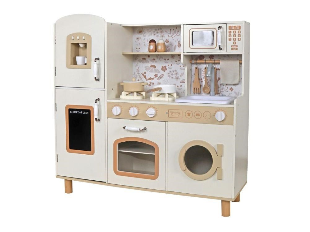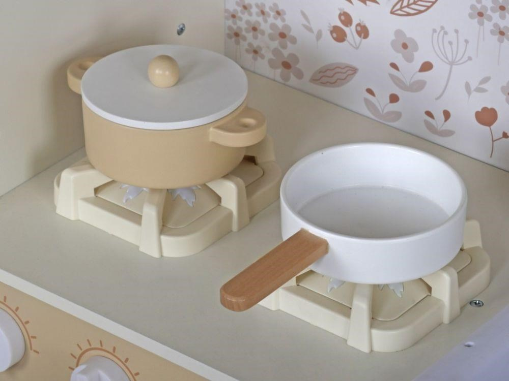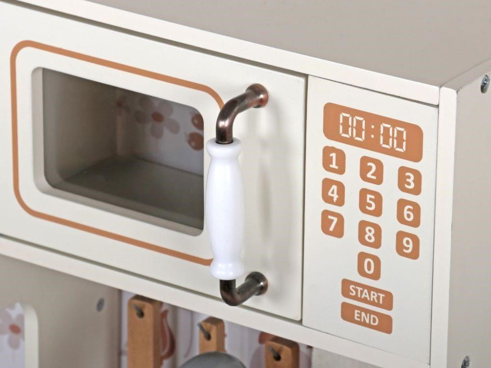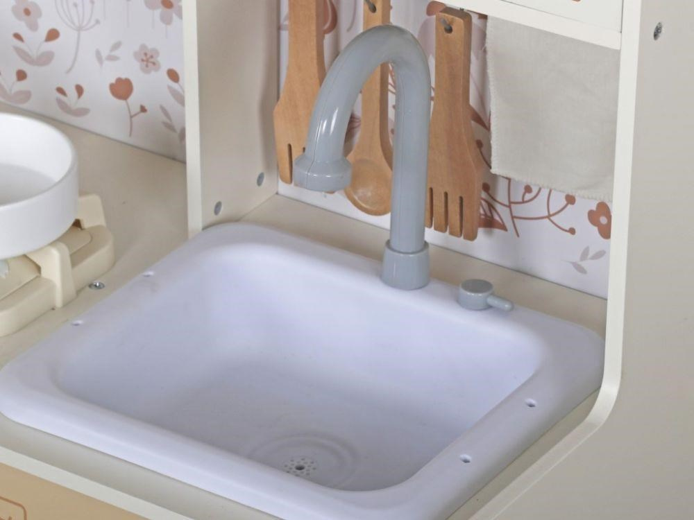 Detská kuchynka v svetlých farebných tónoch, ozdobená kvetmi, je štýlovou edukatívnou hračkou pre deti od 3 rokov veku. V drevenej kuchynke s modernými spotrebičmi a tečúcou vodou si deti uvoľnia svoju fantáziu, môžu variť, piecť a zohrievať jedlá, variť kávu a pokojne vyprať špinavé bielizeň. Jednoducho si vyskúšajú dospelácke činnosti bezpečným detským spôsobom. Reálny nádych celej hre dodajú zvukové efekty, ktoré vydáva sporák alebo vodovodná batéria.