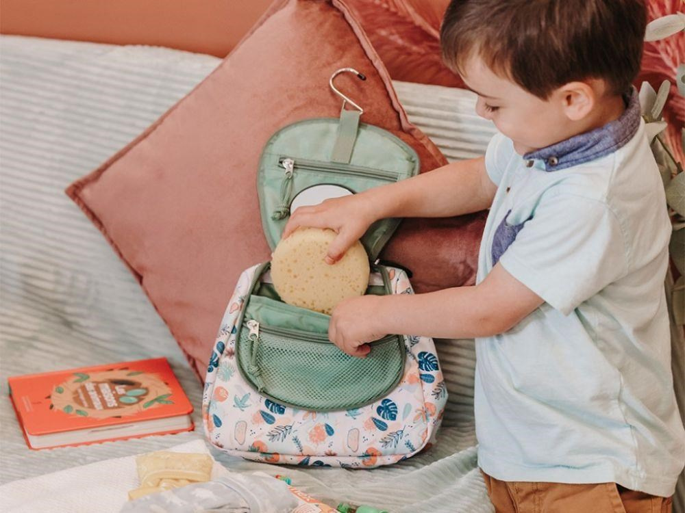 Kosmetická taška na zavešenie, v neutrálnej zelenej farbe, s roztomilým lenochodom, je originálnou detskou toaletnou taškou na cesty. Veľmi pevná a odolná kozmetická taška, so veľkým množstvom vreciek a odnímateľným zrkadlom, pohodlne pojme hygienické potreby vašej dievčatka alebo chlapca. Vodoodpudivý materiál umožní deťom používať tašku v kúpeľni aj vo vani. Vďaka háčiku ju jednoducho zavesíte na háčik alebo vodovodnú batériu a deti majú svoje toaletné potreby pohodlne po ruke.
