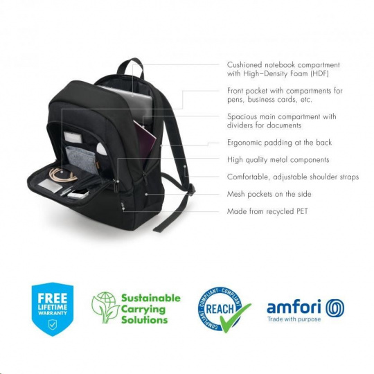 Tento kompaktný batoh ponúka ideálnu ochranu pre notebooky s veľkosťou 15 až 17.3" vďaka výplni z peny s vysokou hustotou (HDF). Jeho ľahká konštrukcia zaručuje flexibilnú mobilitu. Priestranná hlavná časť je rozdelená tak, aby sa dokumenty a príslušenstvo dali uložiť oddelene. Predné vrecko má praktické menšie priehradky, do ktorých si môžete usporiadať menšie predmety, ako je smartfón, perá alebo nabíjačky. V ľahko prístupných bočných sieťovaných vreckách je miesto na fľašu na vodu alebo dáždnik. Môžete si tak byť istí, že všetko, čo potrebujete, máte vždy po ruke. Vďaka ergonomickému polstrovaniu sa batoh pohodlne nosí na chrbte a ramenné popruhy sa dajú nastaviť pre väčšie pohodlie. Ekologický batoh BASE je preto pre vás ideálny, ak ste stále na cestách a chcete podporiť recykláciu PET fliaš ekologickou taškou.