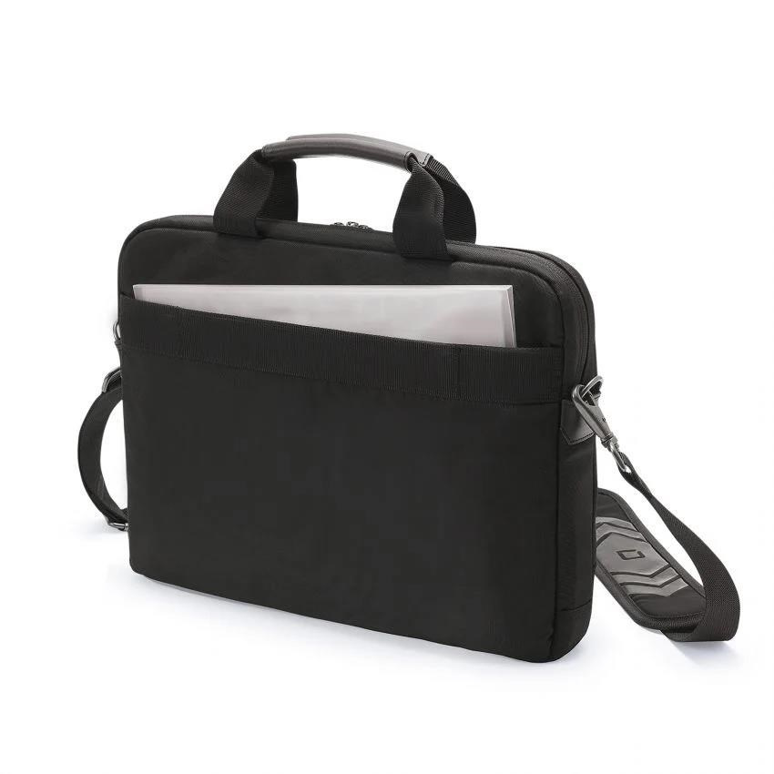 DICOTA is an official participant in the Microsoft Designed for Surface program, which certifies exceptional accessories created by third-party manufacturers to work seamlessly with Surface devices. The Eco Slim Case PRO reliably accompanies you everywhere and meets the highest standards in terms of quality, functionality and protection. The fit-all system separating wall in the notebook compartment lies protectively around your Microsoft Surface device and fits automatically to sizes up to 15". The perforated and thus light EVA foam material optimally protects the edges of your notebook. The high-quality genuine leather handles ensure comfortable transportation for daily use. Besides the notebook compartment, the Eco Slim Case PRO features a well-padded slip pocket designated to tablets up to 10.5". Furthermore, the bag offers generous storage space for documents at the back of the case. The front pocket allows you to organize your personal equipment and additional mobile accessories. With its trolley fastening strap, the bag ensures perfect comfort when travelling along with luggage. The Eco Slim Case PRO is perfect for you if you are always on the go and want to support the recycling of PET bottles with an eco-friendly case. Made of 7.5 recycled PET bottles Compatible with any Surface Pro, Pro X, Laptop, Go, Laptop Go, Laptop SE, Book, Laptop Studio as well as Duo Lockable and cushioned notebook compartment with fit-all system and anti-slip technology Maximum security thanks to Memory Foam and EVA frame protection Notebook compartment for Surface devices up to 15" Cushioned pocket for tablets up to 10.5" Spacious front pocket with zip-pocket and workstation for mobile accessories Open document compartment on the rear High-quality metal features Adjustable shoulder strap with comfortable padding and anti-slip technology Comfortable carry handles made of real leather Trolley belt More Information More Information Item number D30990-DFS Color black Volume in liters 0 Material 900Dx600D rPET Polyester Warranty Lifetime / 30 years EAN 7640186417709 Max. Device Measurements (mm) 340 x 40 x 245 mm 13.39 x 1.57 x 9.65 inch Product Measurements (mm) 375 x 80 x 285 mm 14.76 x 3.15 x 11.22 inch Weight 0.71 kg / 1.56 lbs.