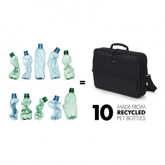 Taška na notebook Eco Multi Plus SCALE 14-15.6" Ľahké puzdro na notebook s ochranným polstrovaním a veľkým úložným priestorom Dnešné činy formujú zajtrajší svet. Preto sa v spoločnosti DICOTA venujeme vývoju riešení šetrných k životnému prostrediu, a preto všetky predmety v našich kolekciách ECO vyrábame z udržateľného recyklovaného PET. Opätovne použijeme až 45 PET fliaš, takže dostanete ekologický výrobok s doživotnou zárukou. Aj naše výrobky z PET majú kvalitu, vzhľad a povrchovú úpravu, ktoré poznáte a máte radi. Špecifikácie Art.no.: D31439-RPET EAN: 7640158666388 Hmotnosť: 0.95 kg Materiál: 600D recyklovaný PET Záruka: doživotná / 30 rokov Rozmery: 415 x 310 x 85 mm Max. Rozmery zariadenia: 385 x 265 x 35 mm Charakteristika - Vyrobené z 10 recyklovaných PET fliaš - Uzamykateľná a vysoko polstrovaná priehradka na notebook - Kovový rám pre dodatočnú ochranu - Okolitá pena s vysokou hustotou ako ochranné polstrovanie - Spoľahlivé upevnenie vďaka upevňovaciemu popruhu a nastaviteľnej deliacej priehradke - Vrecko na tablet s rozmermi do 12.9" - Predné vrecko s funkčnými priehradkami na mobilné príslušenstvo - Dodatočná priehradka na dokumenty na zips na zadnej strane tašky..