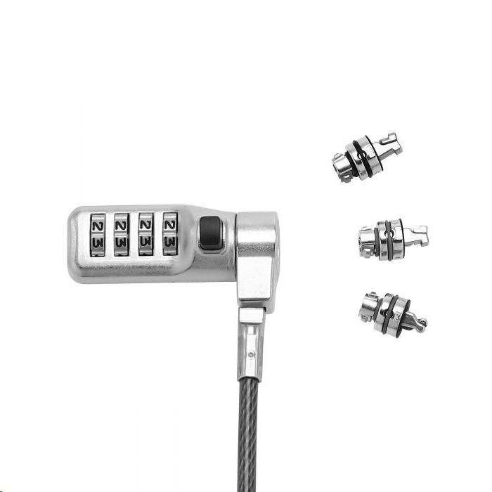 Univerzálny bezpečnostný káblový zámok DICOTA, 3 vymeniteľné hlavy, vhodný pre všetky otvory, prednastavený kód