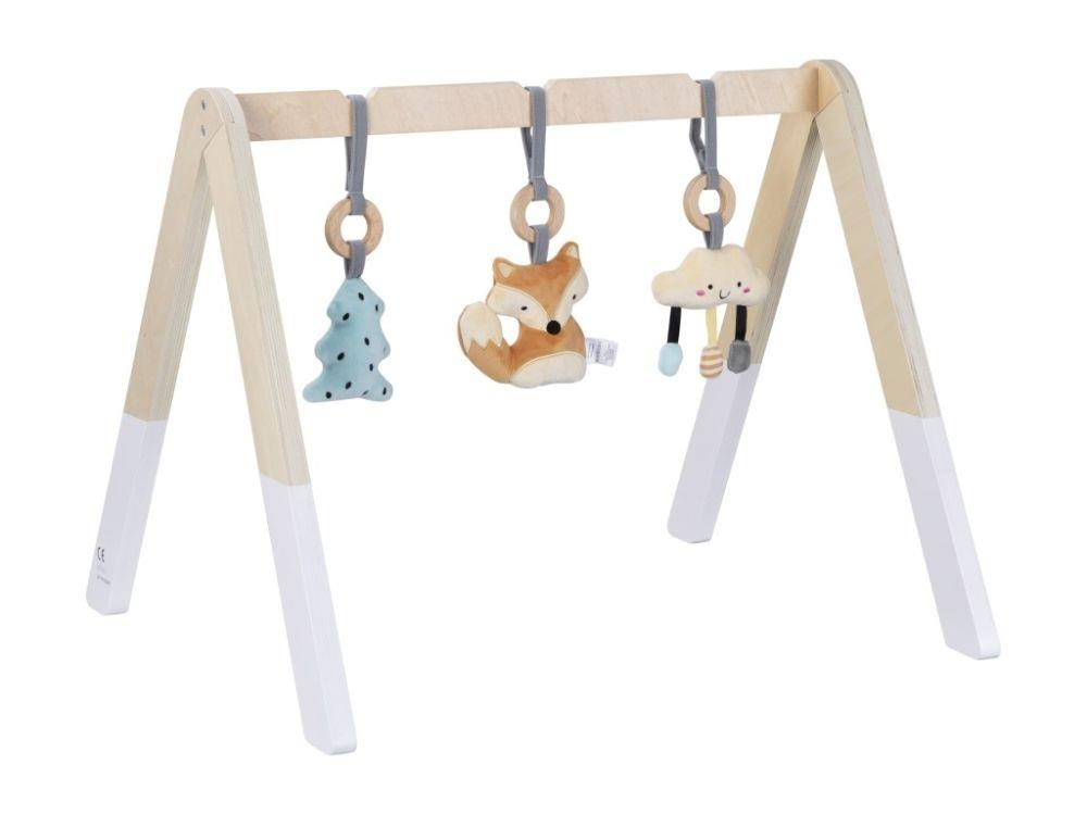 Drevná detská hrazdička so zavesenými hračkami v podobe roztomilej líštičky, stromčeka a obláčika upúta pozornosť každého bábätka. Detská hrazdička v neutrálnych farbách, vhodná pre dievčatká aj chlapcov, stimuluje detské zmysly, motivuje bábätká k pohybu a prieskumu zavesených prvkov. Každú z mäkkých hračiek môžete zo drevnej hrazdičky sundat a použiť ako samostatné hračky.