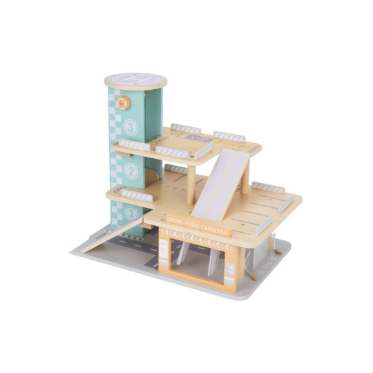Garáž na autíčka s myčkou, v krásnych jemných farbách, prinesie deťom veľa zábavy. Súčasťou 3-poschodovej drevenej garáže je parádna myčka áut, tankovací stojan, výťah, helipad i množstvo parkovacích miest pre autíčka. Bohaté príslušenstvo v podobe helikoptéry, autíček, dopravných značiek a obsluhy garáže umožní, aby si s garážou pre autíčka vyhralo vaše dieťa samo alebo so svojimi kamarátmi.