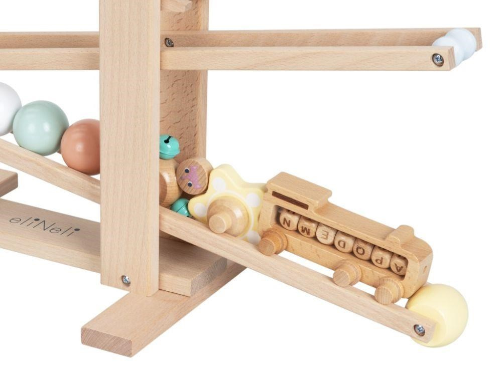 Již zmontovaná drevená guľôčková dráha XL, z tvrdého prírodného dreva, s 6 drevenými zábavnými prvkami a s parádnym vláčikom ZDARMA je zábavnou hračkou pre deti aj celú rodinu. Stačí správne umiestniť jeden z drevených doplnkov (guľôčku, kytičku, koliesko s rolničkami, vláčik) do horného poschodia a sledovať, čo sa bude diať. Hra s guľôčkovou dráhou zdokonaľuje zručnosti, učí deti sústrediť sa a trpezlivosti, niektoré prvky stimulujú zmysly a naučia deti písmenká. Guľôčkovú dráhu nemusíte skladať, je už zmontovaná.
