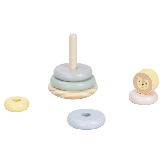 Skládacia veža (pyramída) je obľúbená drevená hračka, ktorá nesmie chýbať v žiadnom detskom kráľovstve. Skládacia veža s kruhmi v jemných pastelových farbách a levíčkom zdokonaľuje jemnú motoriku, koordináciu očí a rúk, logické myslenie, učí deti rozpoznávať rozdiel medzi väčším a menším, sústrediť sa a trpezlivosti.