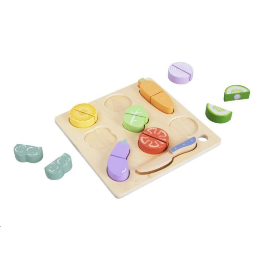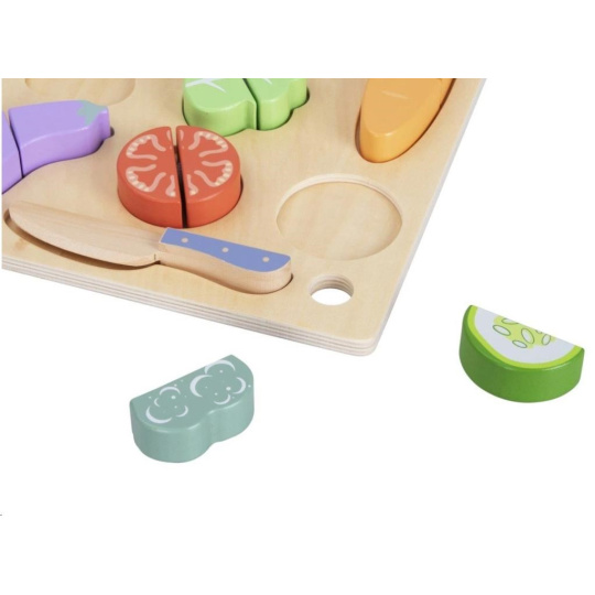 Drevená krájacia zelenina je skvelým doplnkom do detských kuchyniek aj obchodíkov. S krájacou zeleninou sa deti môžu pustiť do varenia, prípravy raňajok alebo desiaty pre svoje obľúbené hračky, kamarátov aj rodičov. Deväť druhov zeleniny, ktorú deti poznajú zo záhradky, z domova alebo z obchodu, je rozdelených na polovice, ktoré drží len suchý zips. Stačí vziať drevený nožík do ruky a na správnom mieste zeleninu rozkrojit. Súčasťou balenia je krásna krájacia doska (destička) aj drevený nôž. Krajacia zelenina je obľúbenou detskou hračkou, vďaka ktorej si deti môžu vyskúšať krájanie nožom bezpečným, detským, spôsobom.