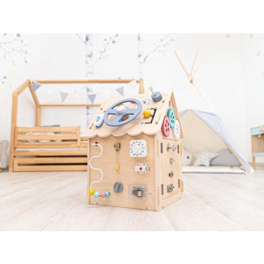 Domeček activity board v prírodnom (natur) prevedení, s montessori a hracími prvkami, s volantom a ďalšími zaujímavými doplnkami láka deti k preskúmaniu, ku hre a k učeniu sa. Drevený activity board domeček je hracou a zároveň výukovou pomôckou. Pri hre deti prirodzeným spôsobom zdokonaľujú svoje schopnosti, učia sa novým veciam a užijú si veľa zábavy.