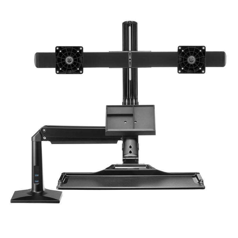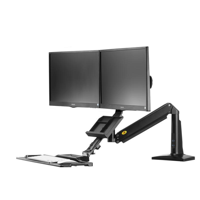 Profesionálny stolový držiak na 2 monitory 17-27" s policou na klávesnicu a myš, ergonomický pre prácu vo vzpriamene alebo vsed E s jednoduchým a rýchlym výškovým polohovaním 480 mm. Monitory je možné na držiaku posúvať do strán, naklápať, otočiť na šírku alebo na výšku, mierne natáčať do strán, výškovo polohovať. Extrémne jednoduché výškové polohovanie celého držiaku vďaka plynové pružine, počas okamihu môžete zmeniť pozíciu vsed E na pozíciu vstoje a otočiť držiak do strán +/- 180°. Profesionálna kvalita s dôrazom na dizajn, 2x USB porty 3.0, systém pre vedenie káblov, jednoduchá inštalácia na stolové dosky o priemere 10-95mm. Farebné prevedenie čierne, záruka 3 roky.