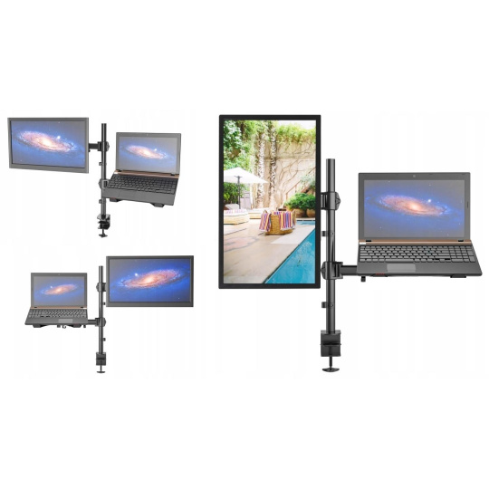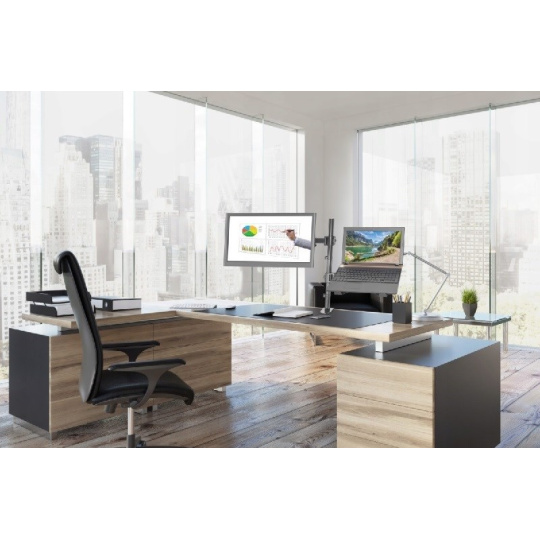 Držiak notebooku alebo laptopu a monitora Fiber Mounts FM23 Kvalitná zostava stolový držiak na monitor 15-27" a držiak na notebook laptop 13-17", polohovateľný, stabilný a pevný Vybavte si kanceláriu skvelým pomocníkom, ktorý vám ušetrí veľa miesta a zlepší ergonómiu pri práci. Zostava Fiber Mounts FM23 obsahuje držiak na monitory 15-27" a držiak na notebooky alebo laptopy s uhlopriečkou 13-17". Držiak monitora podporuje VESA 75x75 a 100x100, je možné ho otáčať do strán, nakláňať, rotovať a výškovo polohovať. Držiak notebooku je možné otáčať do strán a výškovo polohovať. Farebné prevedenie čierne, celková nosnosť 20kg, celokovová konštrukcia. Stolový držiak na monitor a notebook do vašej kancelárie - Fiber Mounts FM23 Technické údaje: nosnosť 20kg na monitory 15-27" na notebooky 13-17" VESA štandard 75x75 a 100x100 otáčanie do strán +/- 135° nakláňanie monitora +/- 90° upevnenie na stolovú dosku s hrúbkou 10-100mm farba čierna záručná doba 3 roky Stolový držiak na monitor a notebook do vašej kancelárie - Fiber Mounts FM23 Držiak na monitory podporuje štandardy VESA: VESA 75x75 VESA 100x100
