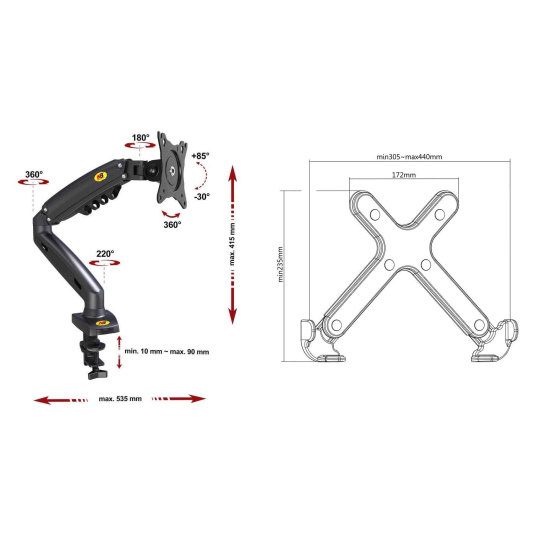 Stolný držiak na notebook laptop Fiber Mounts 836F80 Kvalitný stolný držiak na notebook alebo laptop 11-17,1", výškové polohovanie 165-415mm, otočný +/-180°, náklon notebooku 0° až -90°, vzdialenosť od uchytenia 0-535mm, vedenie káblov, nosnosť 9kg Unikátny systém na uloženie notebooku a jeho ľahkú a rýchlu polohovateľnosť. Držiak Vám umožní výškové polohovanie notebooku, otáčanie do strán, meniť miesto na stole kedykoľvek, ľahko, rýchlo a pohodlne. Držiak je veľmi priateľský k nastaviteľnosti. Vhodný je na uloženie akéhokoľvek notebooku s hmotnosťou až 9kg. Na držiaku sú kryty pre možnosť skrytého vedenia káblov. Možnosť uloženia notebooku alebo laptopu uvítajú každý, kto s ním denne pracuje - nastavenie polohy obrazovky notebooku do úrovne očí (účinné proti bolesti chrbta, chrbtice a hlavy). Možnosť kombinovať aj s držiakom monitora F80 a pri používaní druhého monitora zosúladiť výšku obrazovky notebooku s monitorom. Stolný držiak na notebook laptop do kancelárie, pracovňe alebo detskej izby Fiber Mounts 836F80 Technické údaje: max. zaťaženie 9kg uchytenie akéhokoľvek notebooku alebo laptopu veľkosti 11" až 17,1" šírka notebooku musí byť v rozmedzí 280mm až 440mm výškové polohovanie 250mm (165-415mm) nastavenie vzdialenosti od stolového uchytenia až 535mm otáčanie do strán bez obmedzenia +/- 180° nastavenie náklonu notebooku 0° (vodorovne) až -90° (zvisle) ľahká korekcia roviny rýchla a ľahká zmena polohy notebooku na stole uchytenie držiaku na okraj stolovej dosky alebo skrz stolovú dosku skrutkou vynikajúca kvalita systém pre skryté vedenie káblov 2 typy uchytenia na stolovú dosku (na okraj alebo do priestoru) farba čierna záručná doba 3 roky