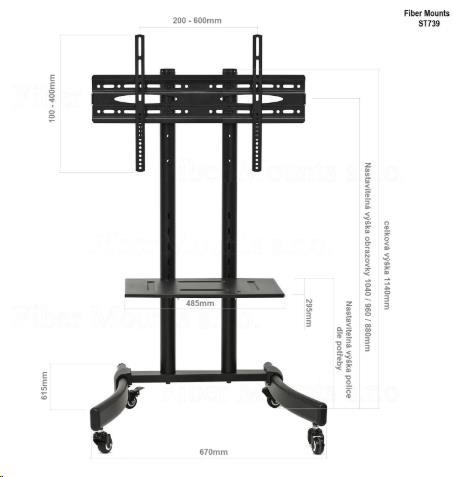 Technické údaje: maximálne zaťaženie vozíka 40kg maximálne zaťaženie police 5kg podpora VESA štandardu 200x100 až 600x400 odporúčané uhlopriečky televízora 32" až 65" celková výška stojanu 1140mm nastaviteľná výška obrazovky v 3 polohách 104 / 96 / 88cm (výška po stred televízora) polica na príslušenstvo o rozmeroch 485x295mm nastaviteľná výška police - možnosť demontáže pevný, stabilný podstavec o rozmeroch 670x615mm farebné prevedenie čierne ekonomické balenie o rozmeroch 1060x350x120mm a hmotnosti 15kg záruka 2 roky Vozík na televíziu Fiber Mounts ST739 podporuje VESA štandardy: VESA 200x100 VESA 200x200 VESA 300x200 VESA 300x300 VESA 400x200 VESA 400x300 VESA 400x400 VESA 600x400