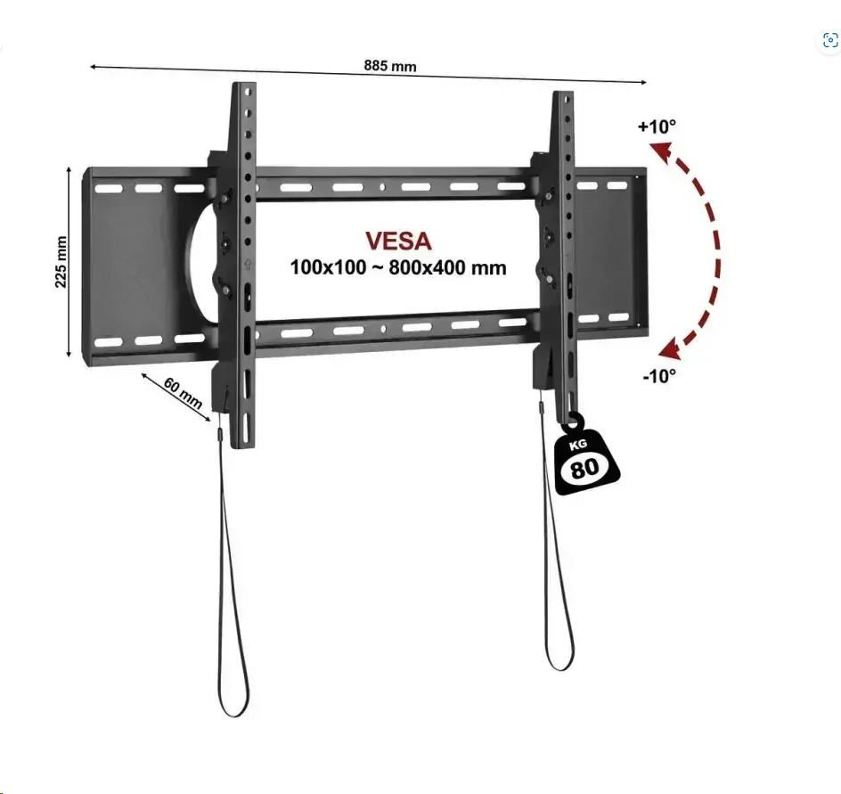 Držiak na televízor Fiber Novelty C5T Profesionálny sklopný držiak na stredne veľké aj rozmerné televízory / monitory 45" - 90", náklon +10° / -10°, vzdialenosť 60mm, automatické zabezpečenie TV proti vysadeniu, inštalačná plocha 885 x 225mm, inštalačný materiál, VESA 100x100 až 800x400, nosnosť 80kg Profesionálny naklápací držiak na stredne veľké aj rozmerné televízory, monitory a displeje s uhlopriečkou 45" až 90". Držiak vyniká pevnou konštrukciou s nosnosťou 80kg, veľkou inštalačnou plochou s mnohými otvormi na ukotvenie do steny. Vzdialenosť od steny je 60mm, čo zabezpečuje dostatočný priestor na odvetrávanie a umožňuje naklonenie TV až o +10° / -10°. Držiak podporuje VESA štandardy 100x100 až 800x400 a má systém automatického zabezpečenia TV na držiaku proti nechcenému vysadeniu. V balení nájdete inštalačný materiál, malú vodováhu a prehľadný manuál. Farebné prevedenie čierne, záruka 5 rokov. Nástenný držiak na televízie C5T umožňuje naklápanie až 10 stupňov nahor i nadol Technické údaje: nosnosť 80kg na TV / monitory / displeje s uhlopriečkou 45" až 90" podporuje VESA štandardy 100x100 až 800x400 vzdialenosť od steny 60mm možnosť naklápenia nahor i nadol +10° / -10° systém pre automatické zabezpečenie obrazovky na držiaku, uvoľnenie pomocou táhel kvalitná veľmi pevná konštrukcia inštalačná plocha 885 x 225mm, mnoho otvorov pre ukotvenie na stenu inštalačný materiál + vodováha farebné prevedenie čierne záruka 5 rokov Fiber Novelty C5T profesionálny sklápací držiak na televízory / monitory Držiak TV C5T podporuje VESA štandardy pre zavesenie: VESA 100x100 VESA 200x100 a 100x200 VESA 200x200 VESA 300x200 a 200x300 VESA 300x300 VESA 400x200 a 200x400 VESA 400x300 a 300x400 VESA 400x400 VESA 600x400 VESA 800x400 VESA držiak na TV na zavesenie na stenu C5T Držiaky C5T dodávame vrátane inštalačného materiálu: 4ks skrutky M6x14mm 4ks skrutky M6x30mm 4ks skrutky M8x16mm 4ks skrutky M8x35mm 4ks podložiek 4ks distančných válečkov 5mm 4ks distančných válečkov 15mm 6ks hmoždinky (cihla, betón, drevo) 6ks vrutov 1ks imbusový kľúč 4mm 1ks inštalačná mini-vodováha prehľadný inštalačný manuál Ak dodávaný inštalačný materiál nie je vhodný na uchytenie práve vašej obrazovky, je potrebné zakúpiť (hobby market) 4ks skrutiek požadovaného priemeru a dĺžky.