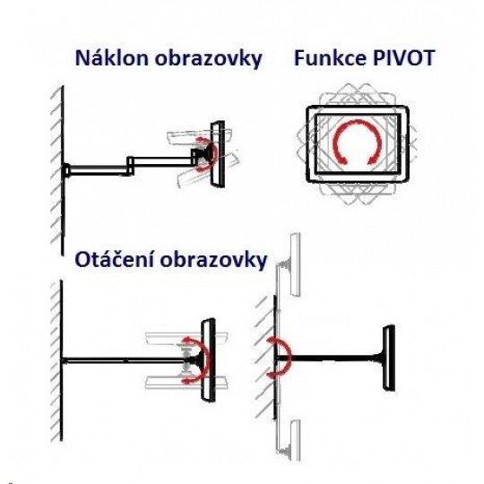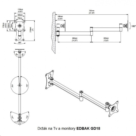 Držiak Televízora monitora Edbak GD18 Otočný, sklopný držiak na Televízor alebo monitor, PIVOT, najdlhšie ramená na trhu, čierny alebo strieborný Veľmi kvalitný držiak, ktorý je vhodný na zavesenie monitorov a menších televízorov na stenu, ale aj stĺpik alebo trám. Držiak má unikátnu konštrukciu - veľmi dlhé ramená, vďaka ktorým je manipulácia s obrazovkou veľmi jednoduchá a bez obmedzení. Odporúčame použitie na miestach, kde je potrebná pomerne veľká manipulácia s monitorom alebo v prípade, že potrebujete veľké vychýlenie obrazovky od miesta ukotvenia držiaka. Výborná kvalita. Odporúčame. Polohovateľný držiak na Televízor alebo monitor 15-30 palcov, otočný, sklopný, dĺžkovo nastaviteľný - EDBAK GD18 / drzakyastolky.cz Popis výrobku: nosnosť 10 kg na monitory a Televízory s uhlopriečkou 15" až 30" podporuje VESA štandard 75x75 a 100x100 možnosť rozšírenia VESA štandardu na 200x100 alebo 200x200 (za príplatok) otáčanie do strán +/- 90° sklon +10° až -80° funkcia pivot - horizontálne aj vertikálne otáčanie obrazovky minimálna vzdialenosť od steny 120mm maximálna vzdialenosť od steny 792mm - najdlhší držiak na monitory na trhu!!! výborná kvalita oceľová konštrukcia farba čierna, strieborná alebo biela záruka 5 rokov Držiak podporuje VESA štandardy: VESA 75x75 VESA 100x100