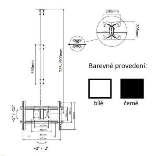Technické údaje: maximálne zaťaženie 68kg podpora VESA štandardov 100x100 až 600x400 odporúčaná uhlopriečka obrazovky 32 až 60 palcov nastaviteľná dĺžka 725-1500mm možnosť náklonu obrazovky +5° až -15° vyrovnanie TV po montáži +/- 2° uchytenie na strop alebo na stenu - úchyt je možné otočiť o 90° otočný o +/- 30° vynikajúca kvalita moderný dizajn farebné prevedenie čierna záruka 5 rokov Držiak podporuje VESA štandardy: VESA 100x100 VESA 200x100 VESA 200x200 VESA 300x200 VESA 300x300 VESA 400x200 VESA 400x300 VESA 400x400 VESA 600x400