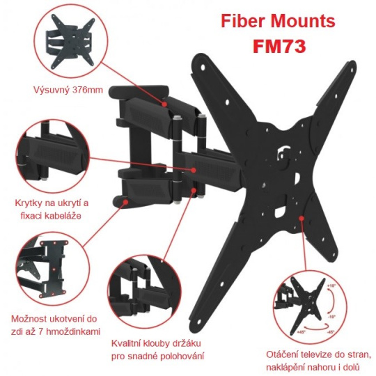 Dvojramenný otočný držiak na TV Fiber Mounts FM73 Kvalitný polohovateľný držiak na televízie 30-60", dvojramenný. nosnosť 35kg Nástenný držiak pre spoľahlivé a bezpečné zavesenie televízie na stenu a jej úpravu polohy. Držiak je ideálny na TV 30-60", podporuje VESA 75x75 až 400x400 a môžete naň zavesiť televíziu s hmotnosťou až 35kg. Držiak umožňuje televízii vysúvať od steny, otáčať do strán a naklápať nahor aj nadol. Konštrukcia je oceľová a je vybavená dizajnovými krytkami, pod ktorými ľahko skryjete a zafixujete všetky káble. Farebné prevedenie čierne, záruka 5 rokov. Nástenný dvojramenný držiak na otáčanie a naklápanie televízie Fiber Mounts FM73 Technické údaje: nosnosť 35kg podporuje VESA 75x75 až 400x400 vhodný na televízie s uhlopriečkou 30" až 60" minimálna vzdialenosť televízie od steny 74mm maximálna vzdialenosť televízie od steny 450mm otáčanie televízie na obe strany +/- 45° naklápanie televízie hore alebo dole o +/- 10° dizajnové krytky konštrukcie so systémom na skrytie káblov výnimočná kvalita, oceľová konštrukcia balenie obsahuje inštalačný materiál farebné prevedenie čierne záruka 5 rokov Držiak pre zavesenie televízie na stenu s kvalitnou dvojramennou konštrukciou Fiber Mounts FM73 Nástenný dvojramenný držiak TV Fiber Mounts FM73 podporuje VESA štandardy: VESA 75x75 VESA 100x100 VESA 100x200 VESA 200x100 VESA 200x200 VESA 300x300 VESA 400x400 Držiak Fiber Mounts FM73 je vhodný na zavesenie každej televízie, ktorá podporuje ktorýkoľvek z vyššie uvedených VESA štandardov a jej hmotnosť nie je vyššia ako 35kg. Na uhlopriečke televízie nezáleží, televízia môže mať aj výrazne viac ako 60".