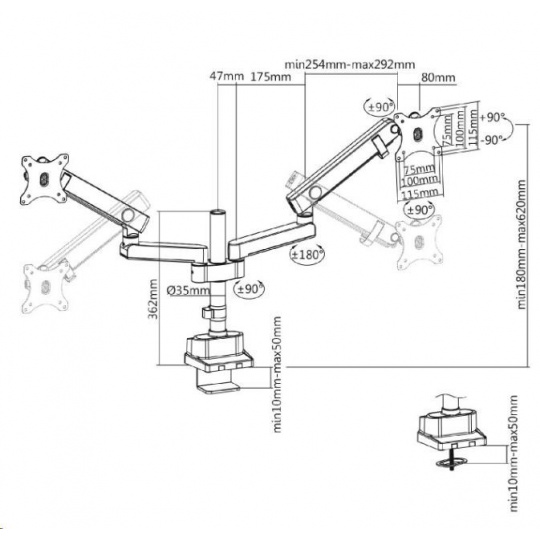 Dvouramenný stolový držiak na 2 monitory Mounts AX812 Profesionálny plne nastaviteľný stolový držiak na 2 monitory 17-32", nosnosť 16kg Stolový držiak do kancelárie alebo pracovne na zavesenie dvoch monitorov s uhlopriečkou 17-32". Držiak má nezávislé nastavenie polohy každého ramena, preto môžete umiestniť každý monitor presne tam, kde ho potrebujete. Vynikajúca kvalita a profesionálne spracovanie zaručuje, že Vám bude držiak spoľahlivo slúžiť naozaj veľmi dlhú dobu. Farebné prevedenie čierne. Záruka 5 rokov. Technické údaje: nosnosť 16kg (2 x 8kg) podpora VESA štandardov 75x75 a 100x100 na monitory s uhlopriečkou 17" až 32" nezávislé nastavovanie polohy každého ramena držiaka otáčanie do strán +/- 90° nastavenie náklonu +/- 75° rotácia obrazovky - horizontálne alebo vertikálne otočenie monitoru výškové nastavovanie - nastavenie výšky na každom ramene a celkovo na nosnej tyči minimálna výška 180mm, maximálna výška 620mm uchytenie na stolovú dosku o priemere 10mm až 50mm 2 typy upevnenia - na okraj stola alebo do priestoru integrované porty USB 3.0 - 2x materiál hliník + oceľ farebné prevedenie čierne záruka 5 rokov Držiak na dva monitory AX812 podporuje VESA štandardy: VESA 75x75 VESA 100x100 rozšírenie na 200x100 a 100x200 (nie je súčasťou balenia, zakúpenie za príplatok) rozšírenie na 200x200 (nie je súčasťou balenia, zakúpenie za príplatok)