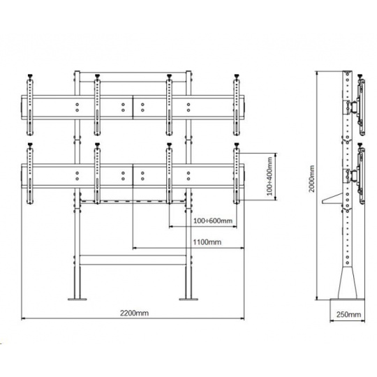 Technické údaje: maximálne zaťaženie 210kg maximálna hmotnosť 1 monitora alebo televízora 50kg na televízory a monitory s uhlopriečkou 50÷57" zavešenie obrazoviek v horizontálnej polohe podpora VESA štandardu 100x100 ÷ 600x400mm výška televíznej steny 2000mm výškové nastavenie každej rady monitorov podľa potreby posun monitorov do strán zabezpečenie proti vysadeniu monitoru nutné ukotvenie do podlahy profesionálna televízna stena najvyššej kvality a spracovania jednoduchá montáž, rýchla inštalácia záruka 10 rokov Podporované VESA štandardy: VESA 100x100 VESA 200x100 a 100x200 VESA 200x200 VESA 300x200 a 200x300 VESA 300x300 VESA 400x200 a 200x400 VESA 400x300 a 400x400 VESA 400x400 VESA 600x400