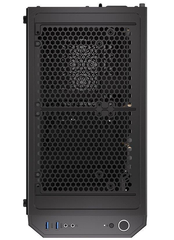 Skriňa formátu Middle Tower s priehľadnou bočnicou z tvrdeného skla ponúka dve 2,5" pozície pre SSD disky a dve 3,5" pozície pre pevné disky. Na hornej časti sa nachádza dva USB 3.0 porty, výstup na slúchadlá a vstup pre mikrofón. Vybavená je dvomi 120 mm ventilátormi, ktoré spolu s perforovaným čelným panelom zabezpečujú dostatočné prúdenie vzduchu. Dômyselné riešenie umožňuje pohodlné umiestnenie až 360 mm dlhého výmenníka vodného chladenia na prednej strane. V skrini je dostatok miesta pre chladič CPU do výšky až 161 mm a grafickú kartu s dĺžkou až 350 mm. Dodávaná je bez zdroja. Súčasťou je tiež sada prašných filtrov.