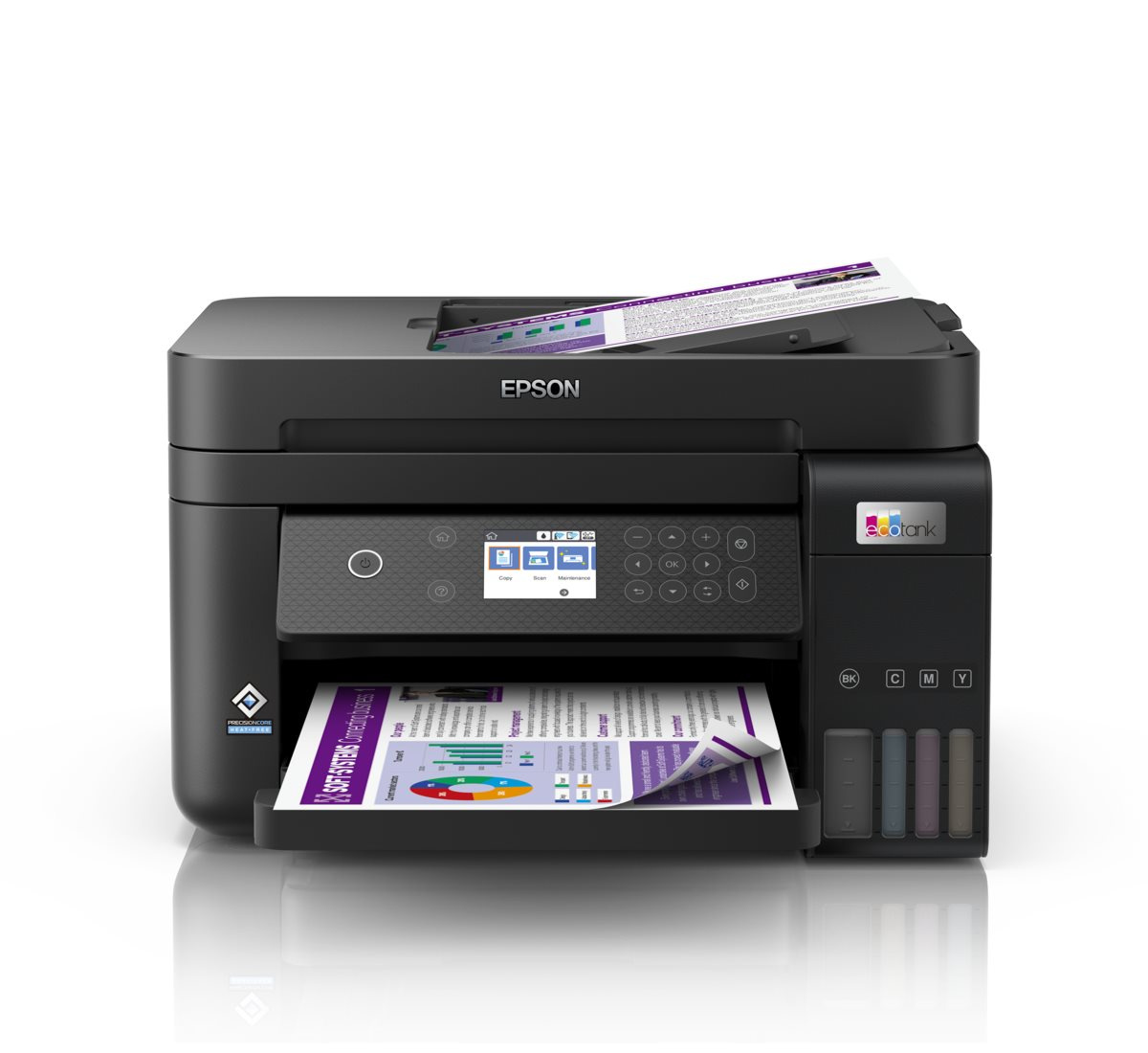 Ušetrite až 90 % nákladov na tlač s tlačiarňami EcoTank od spoločnosti Epson, ktoré nevyužívajú atramentové kazety. Integrované atramentové nádržky s veľkokapacitnými fľaštičkami s atramentom sa vďaka špeciálne navrhnutým fľaštičkám ľahko dopĺňajú. Vďaka žiadnym atramentovým kazetám, ktoré nie je potrebné vymieňať, flexibilným funkciám pripojenia a automatickému podávaču dokumentov je táto tlačiareň ideálna pre každého, kto hľadá vysokokvalitné výtlačky za neuveriteľne nízke náklady na stránku.