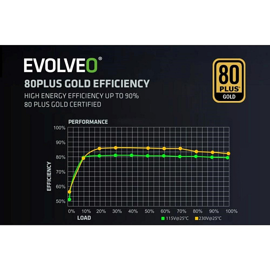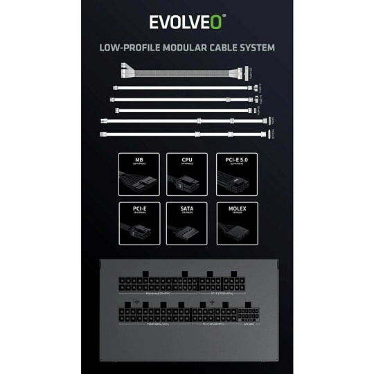 Zdroj EVOLVEO G1000 je ideálna voľba pre herný počítač, ktorý má osadenú grafickú kartu s rozhraním PCIe 5.0. Vyčnieva predovšetkým účinnosťou s certifikáciou 80 PLUS GOLD zaručujúcou účinnosť až 90%. Zdroj je plne modulárny, preto je možné pripojiť len najsilnejšie káble. Súčasťou je aj tichý 140mm ventilátor. V kombinácii s semi-pasívnym chladením do 30% zaťaženia je zaručený tichý chod zdroja. Semipasívne chladenie, ventilátor zdroja je zvyčajne neaktívny a spustí sa iba pri prekročení 20% hranice výkonu zdroja. Nedeliteľnou súčasťou sú aj ochrany proti poškodeniu komponentov v PC a aj samotného zdroja.